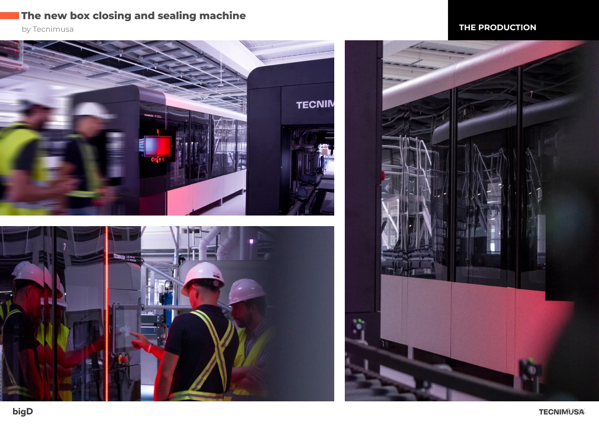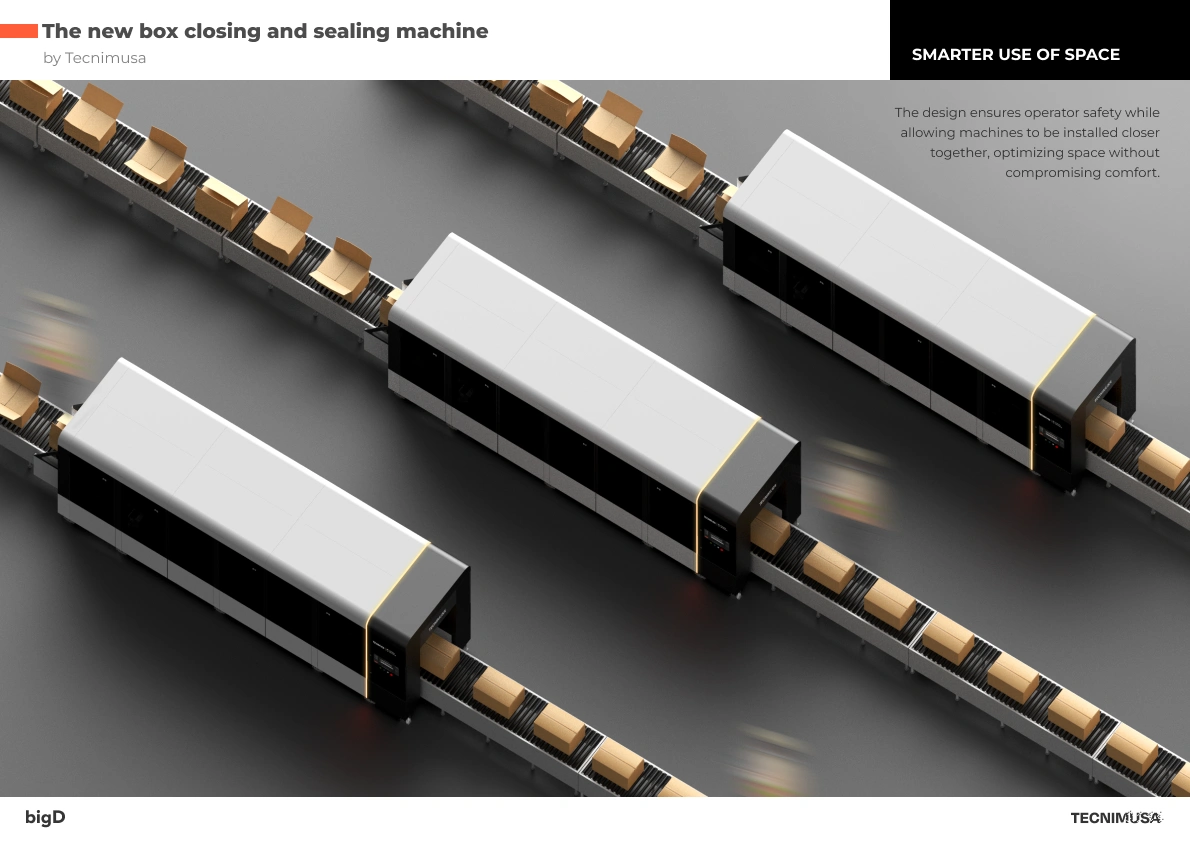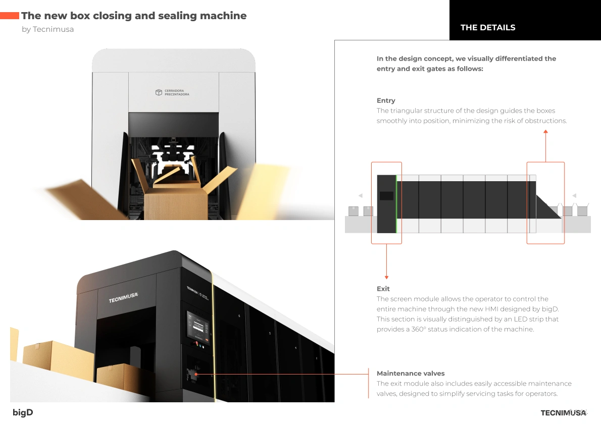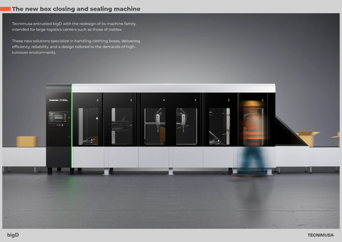 Tecnimusa encarga a bigD el Diseño Industrial de su nueva máquina cerradora y precintadora de cajas. Nuestra misión en este proyecto ha sido clara: repensar la máquina en su totalidad para adaptarla a los estándares de calidad, eficiencia y diseño necesarios en un entorno de operaciones a gran escala. Desde su arquitectura modular hasta la interfaz digital (HMI), hemos trabajado en cada detalle para garantizar una integración perfecta entre lo físico y lo digital, logrando así una solución «Phygital» de última generación.