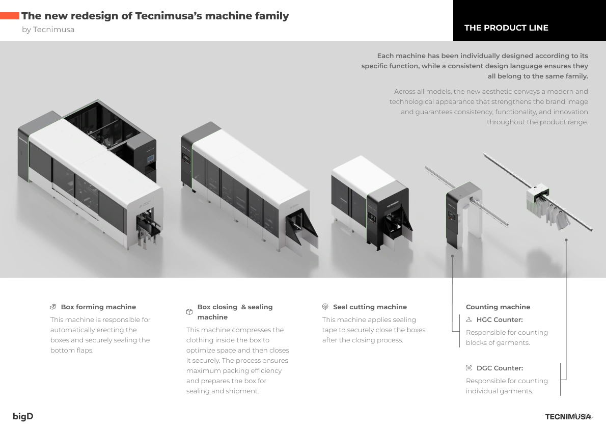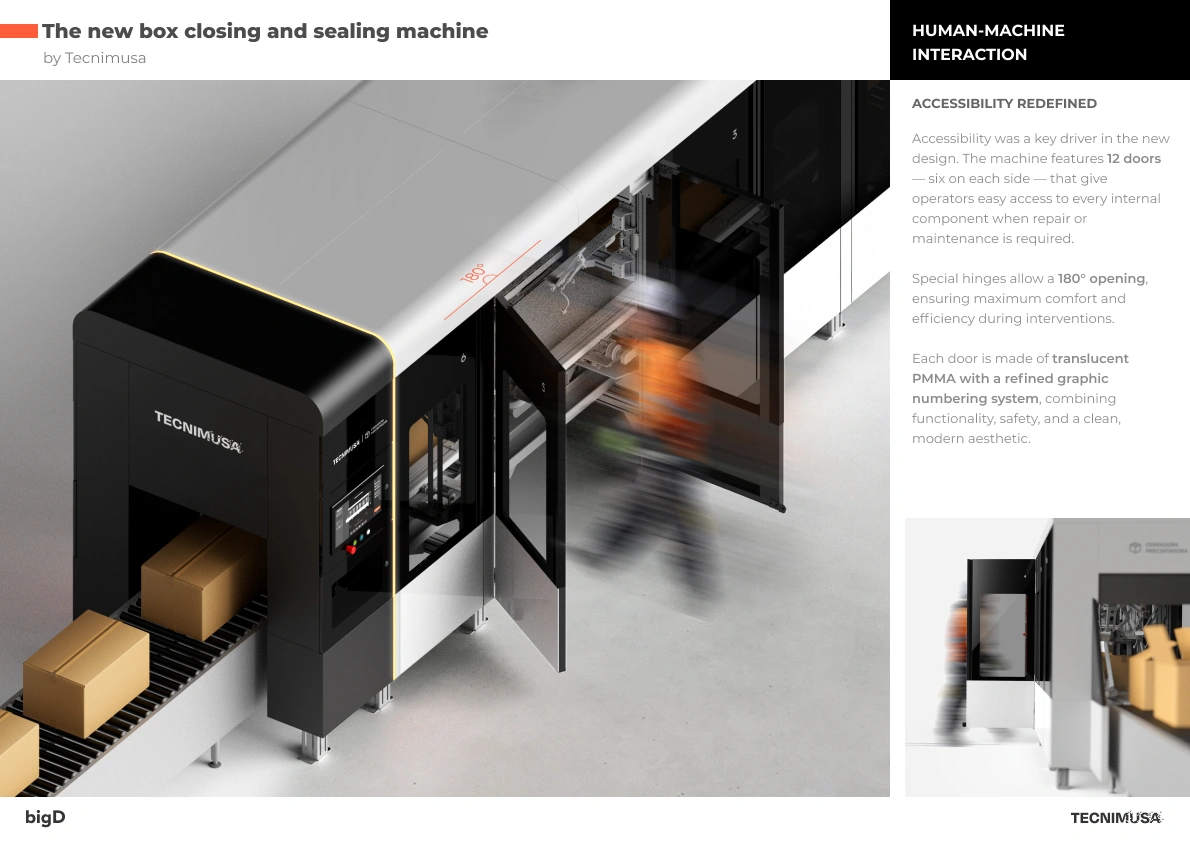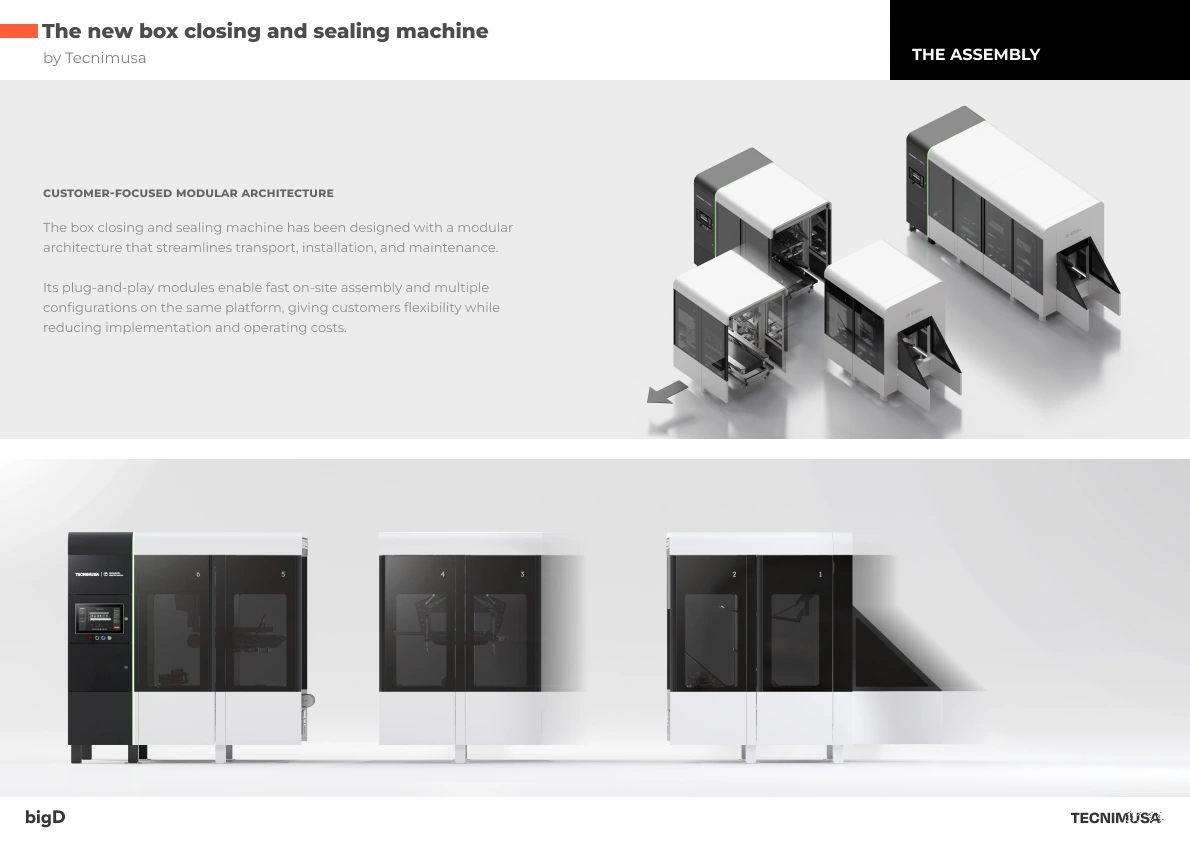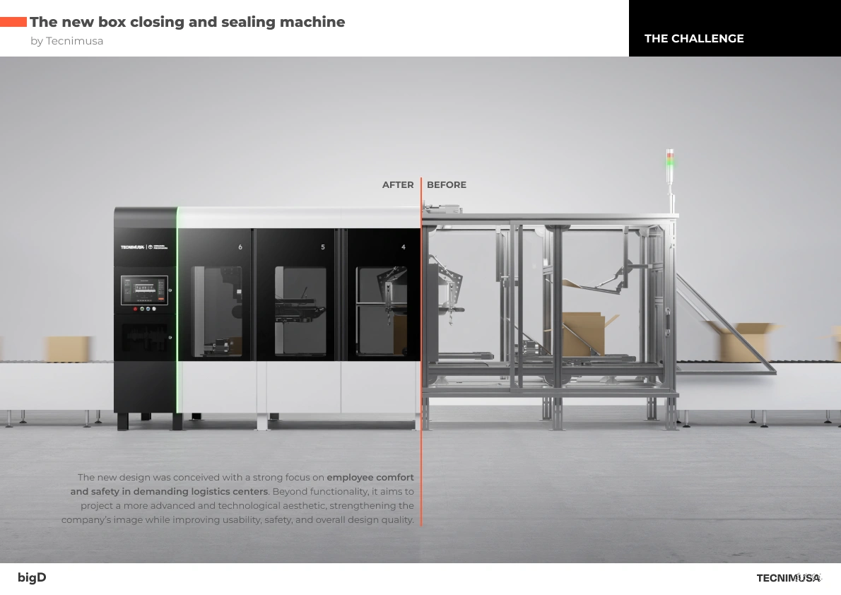Tecnimusa commissions bigD with the Industrial Design of its new box closing and sealing machine. Our mission in this project has been clear: to rethink the entire machine to adapt it to the quality, efficiency and design standards required in a large-scale operating environment. From its modular architecture to the digital interface (HMI), we have worked on every detail to ensure a seamless integration between the physical and the digital, achieving a last generation “Phygital” solution.